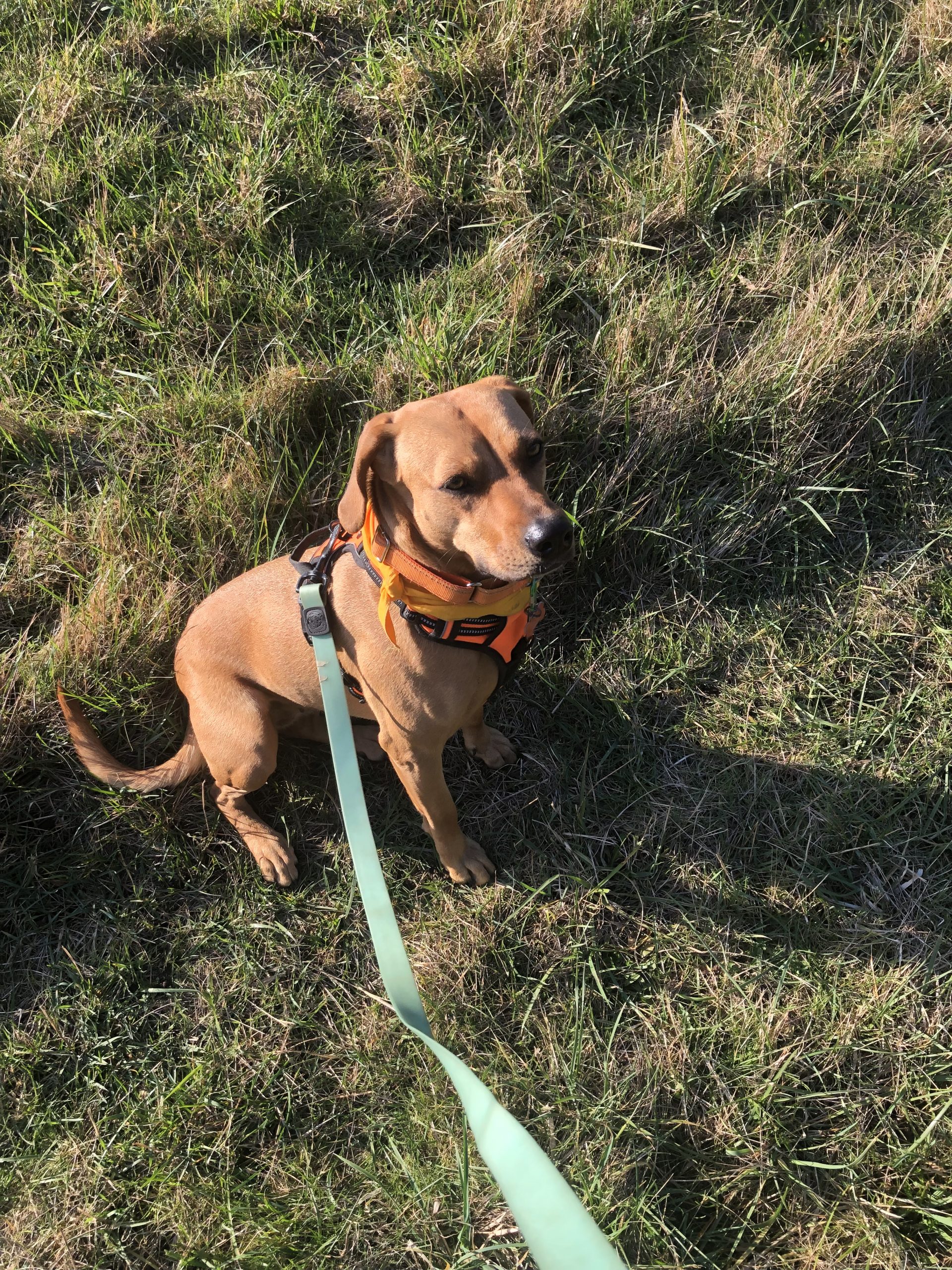 She has gone on a couple field trips and does not pull on the leash, just wants to smell all the smells.  She is incredibly sweet and loves to be cuddled.  She gets along with all the dogs at the ranch, however will let another dog know through a low growl if she doesn't want to interact. She has never been aggressive to any dogs at the ranch.