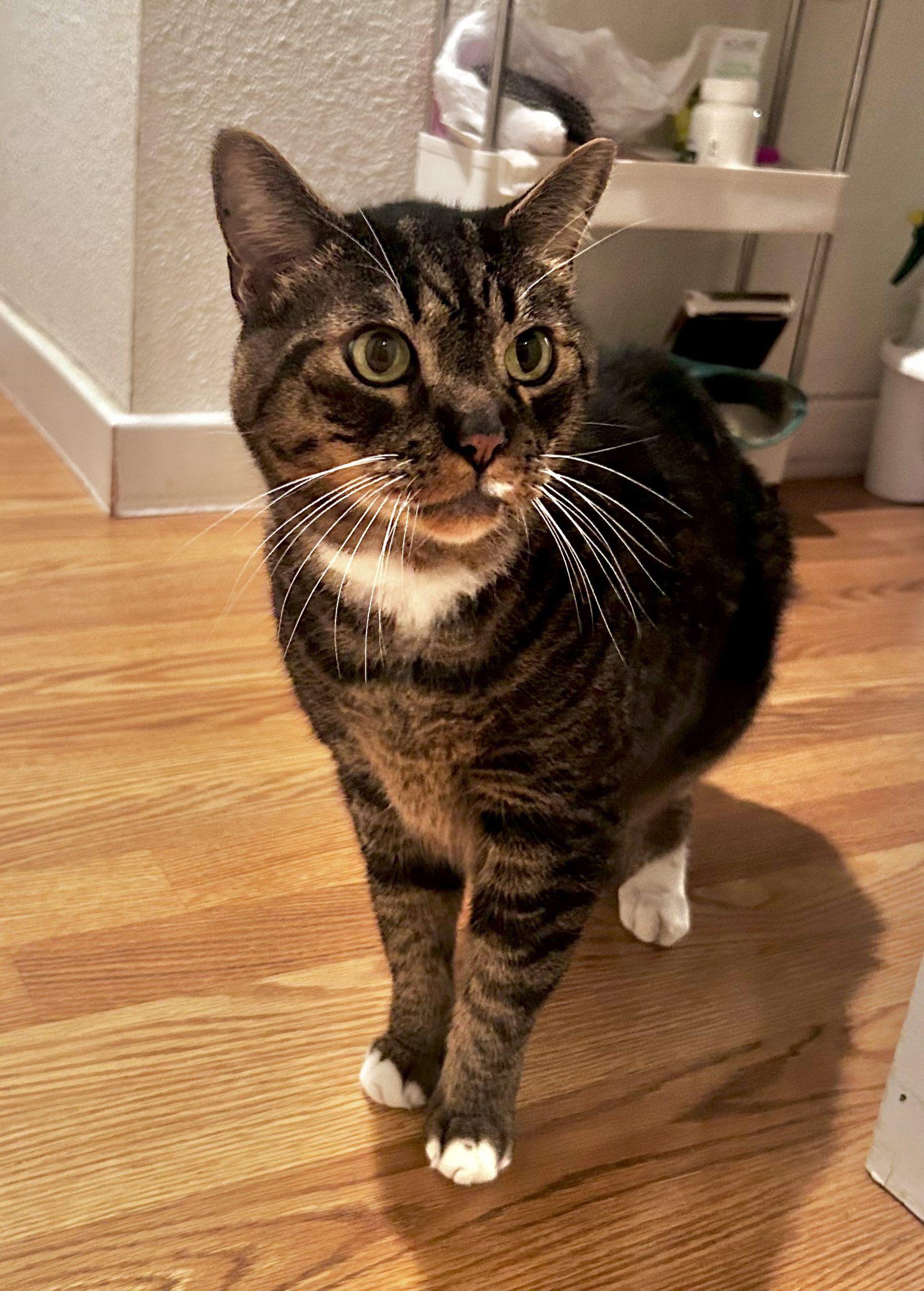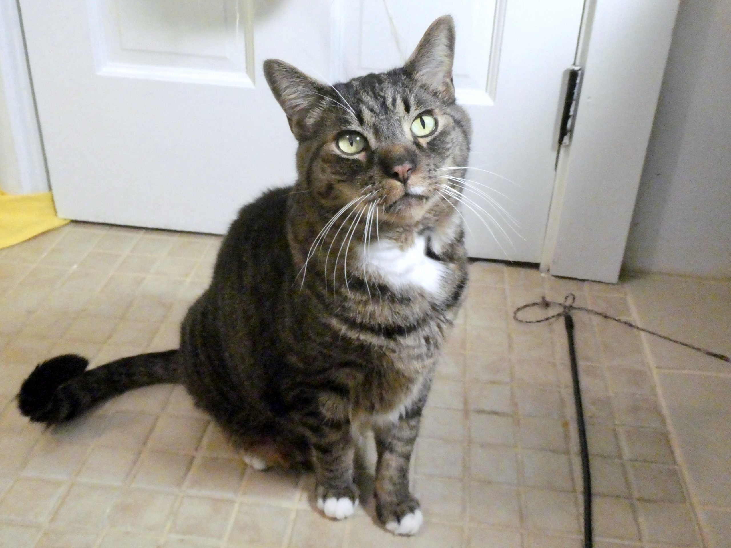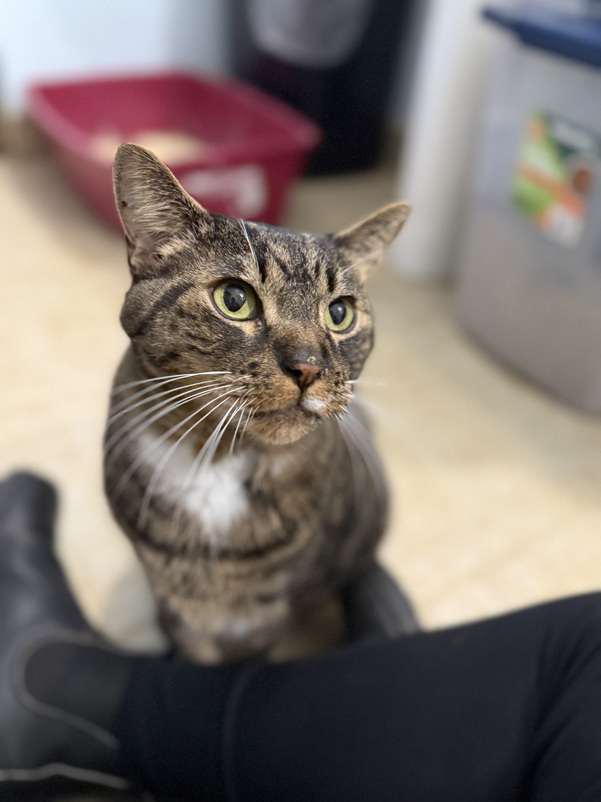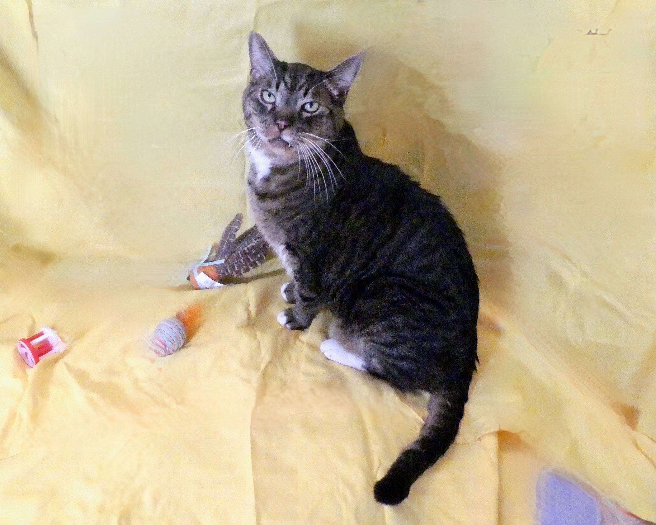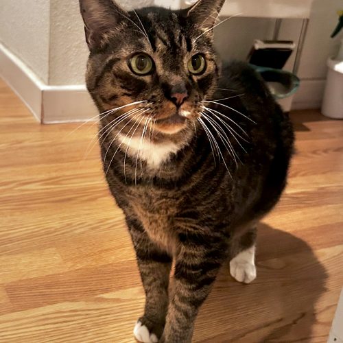 This handsome guy is very friendly; he only takes a moment or two to warm up to new people. He greets his visitors hearty head bonk and a chorus of purrs. And did we mention that cute little fang?