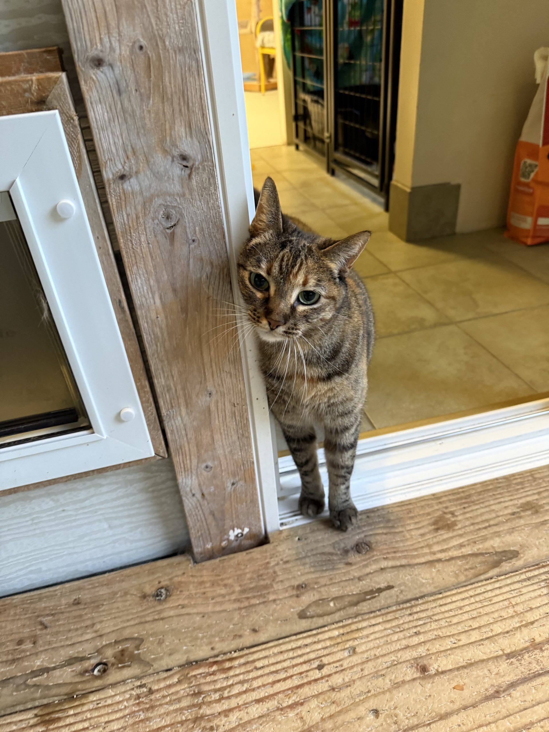 This friendly girl is super confident in new environments. She will come in for cuddles, then retire to a nice high perch to stretch out and snooze while she keeps an eye on her favorite people. She's not a big fan of dogs or other animals, and would prefer to be a solo artist in her new home with the exception of her buddy, Kif. Farnsworth would be a great match for a household of adults or a family with older, cat-savvy kids. She requires an indoor-only home.