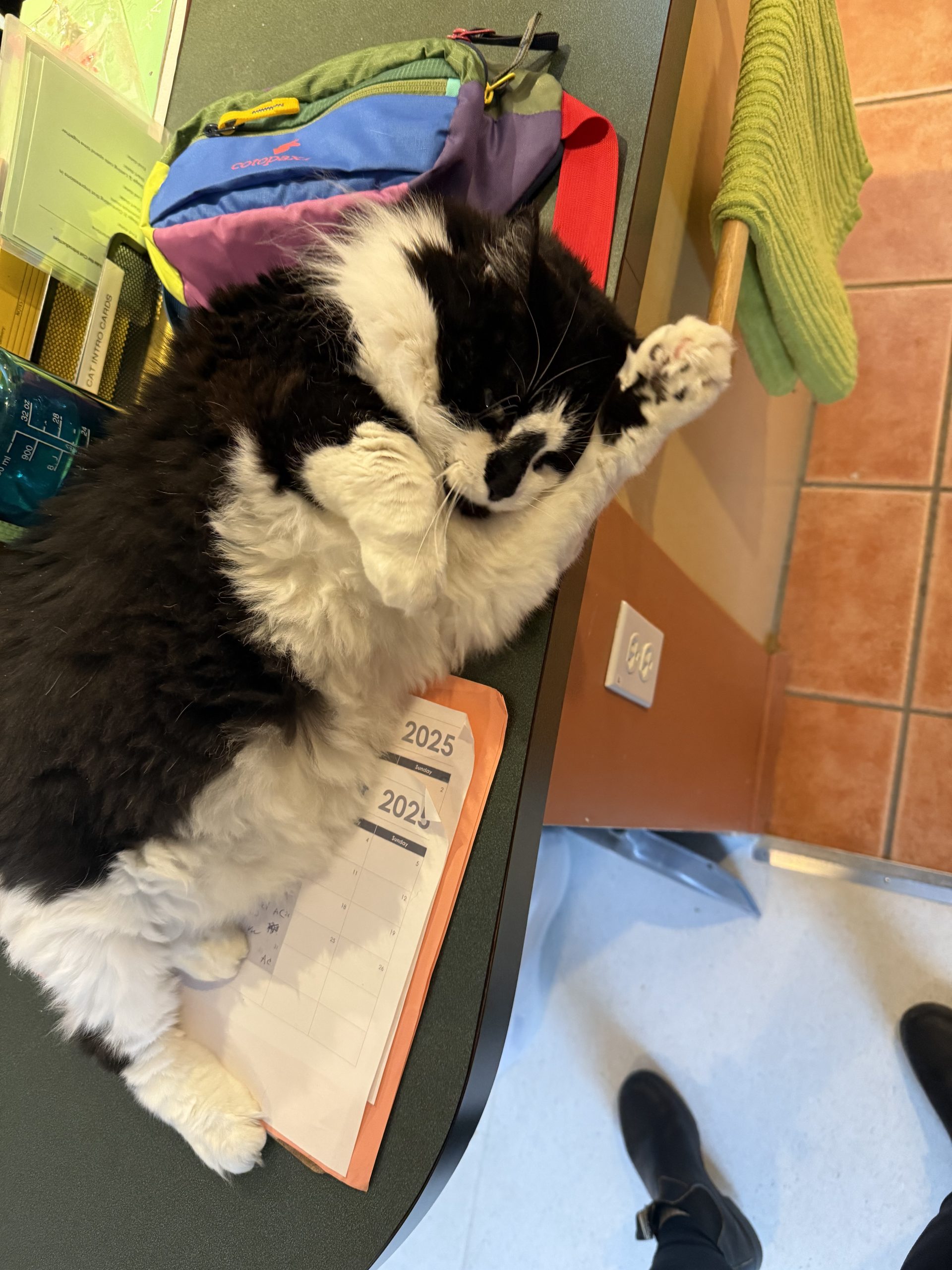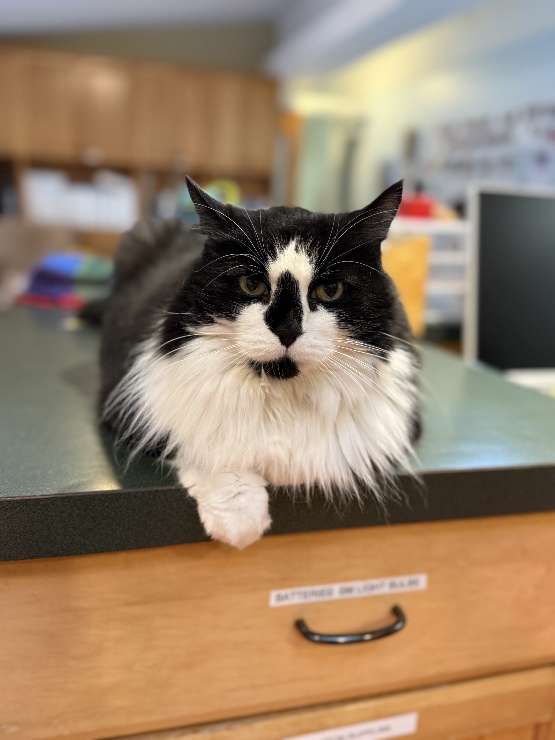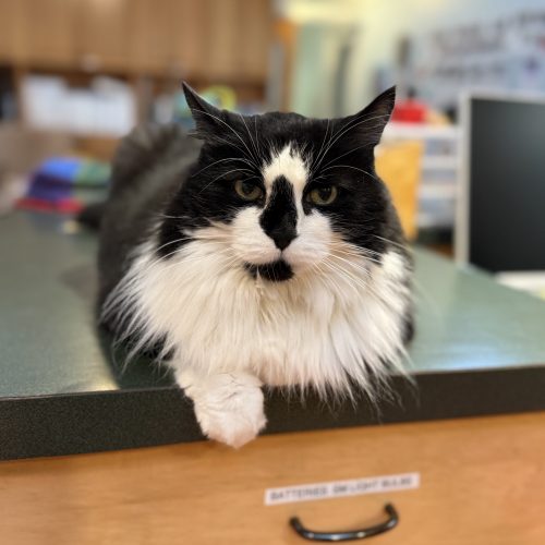 Kitty Bear rules over the shelter’s lobby with a fair and loving paw and is a volunteer favorite. She’s spunky, sweet, and loves to cuddle. (On her own terms, she’s a busy gal overseeing her staff!)