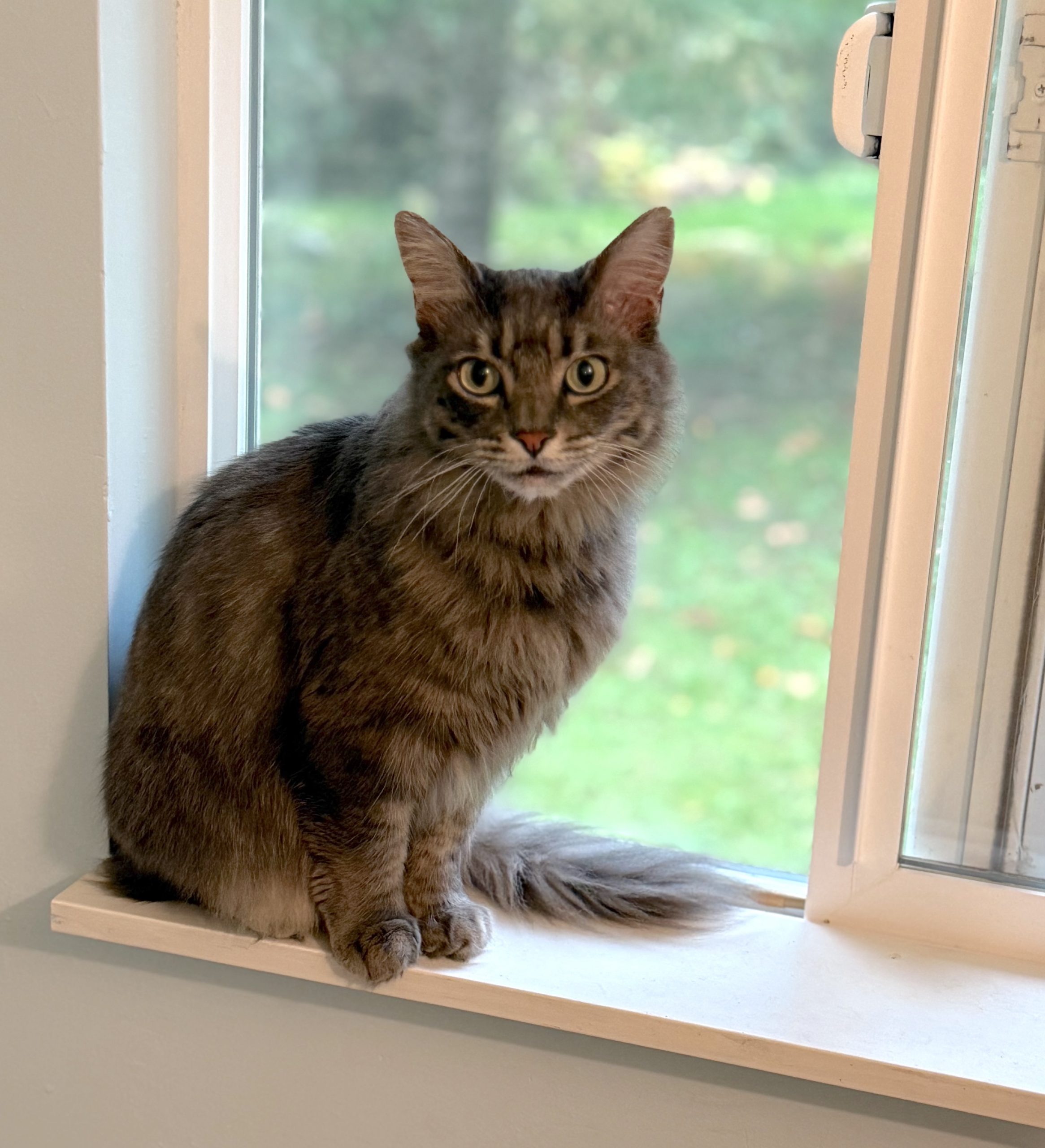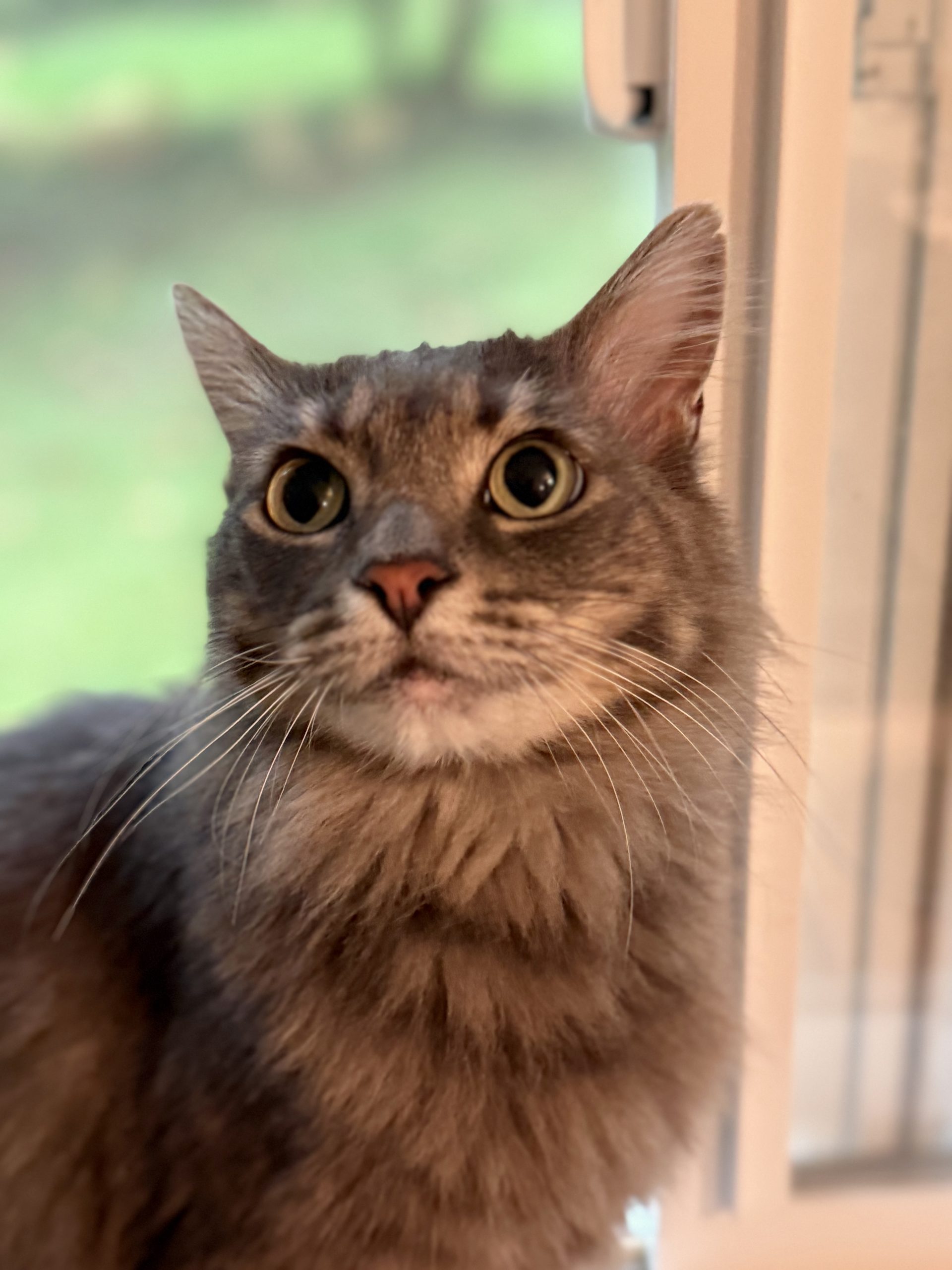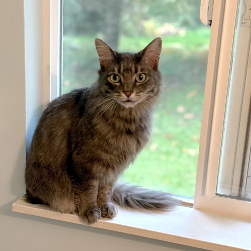 This beautiful grey tabby girl is extremely friendly and loves to greet folks with rumbly purrs, hearty head bonks, and her newest vocal composition. She's settling in at the shelter, and no doubt her gorgeous personality will soon make her the star of the show. (Plus, look at those ear tufts!)