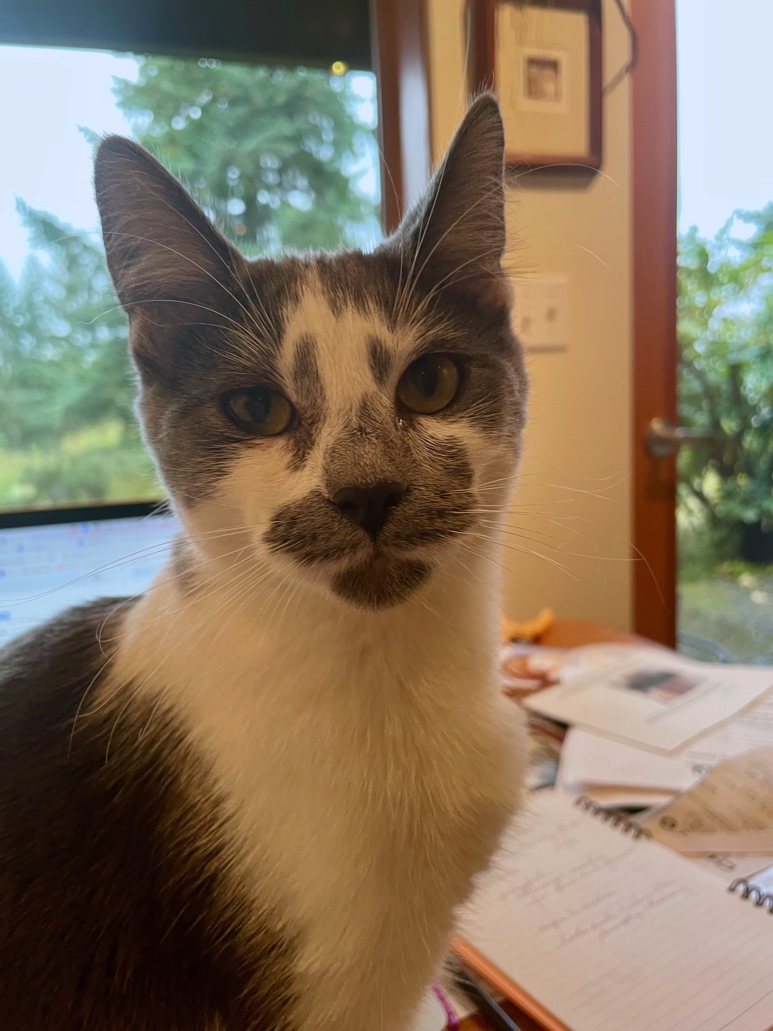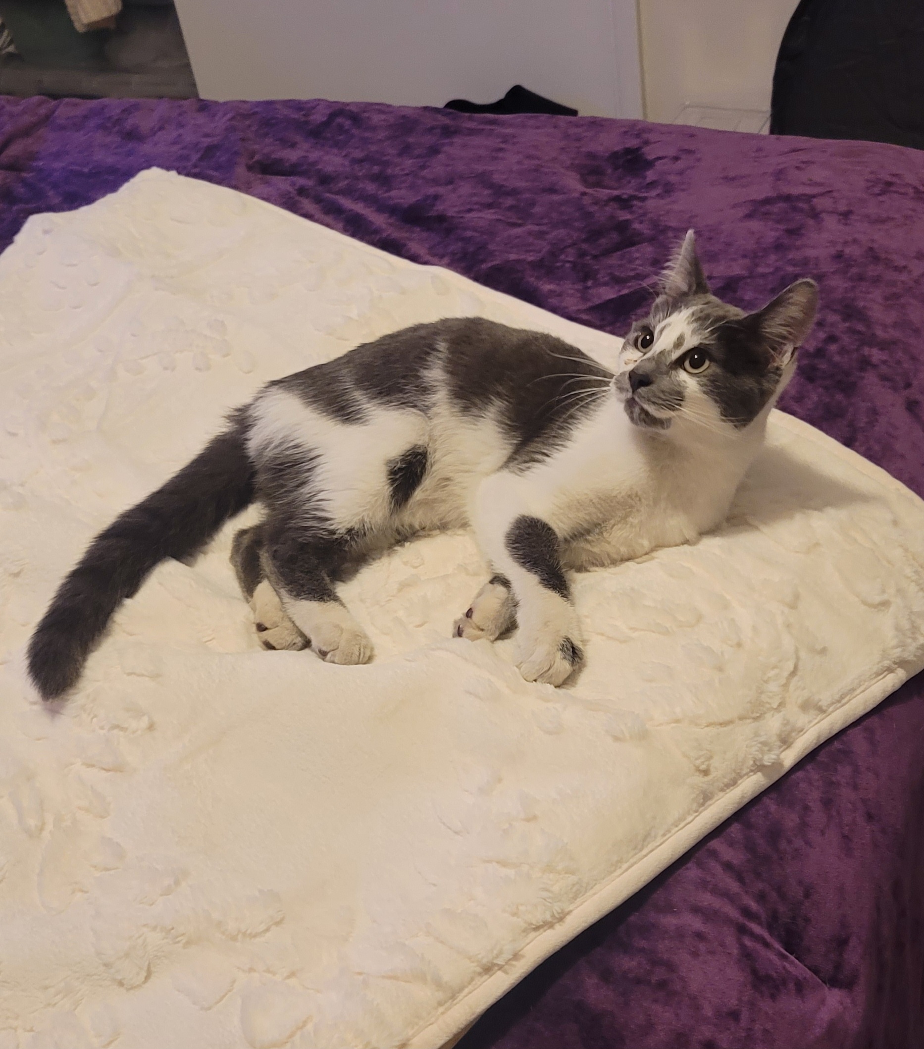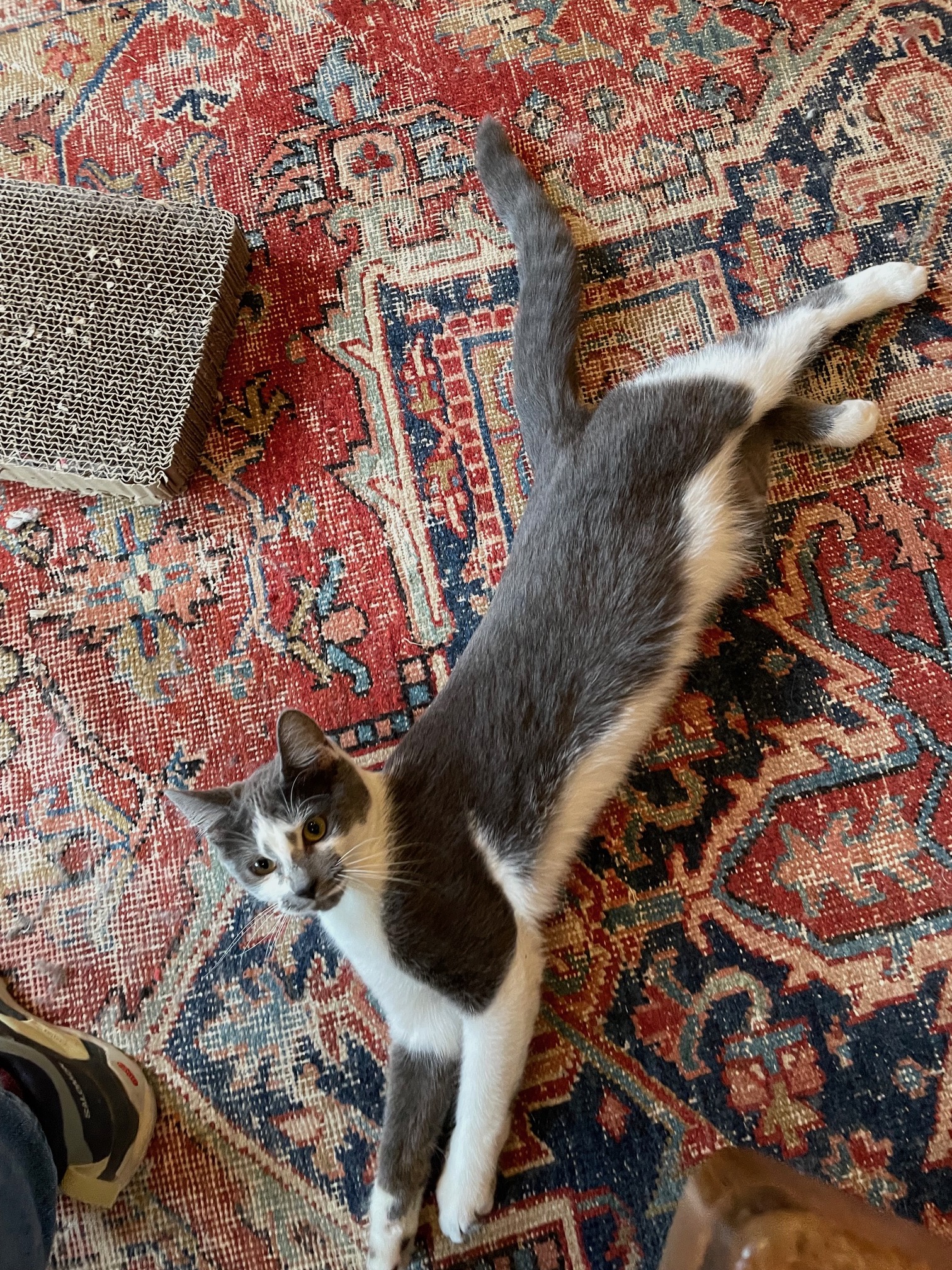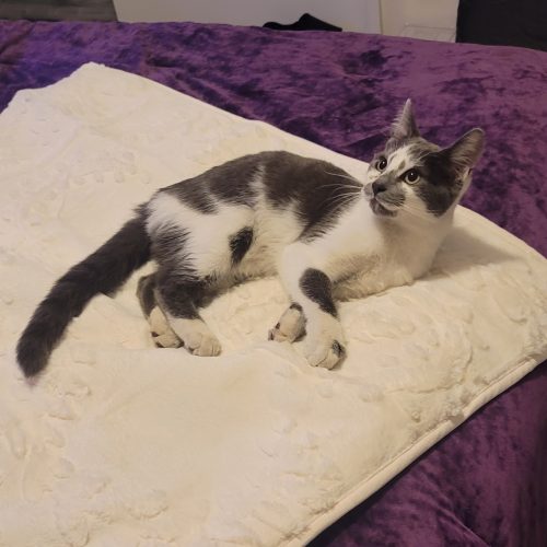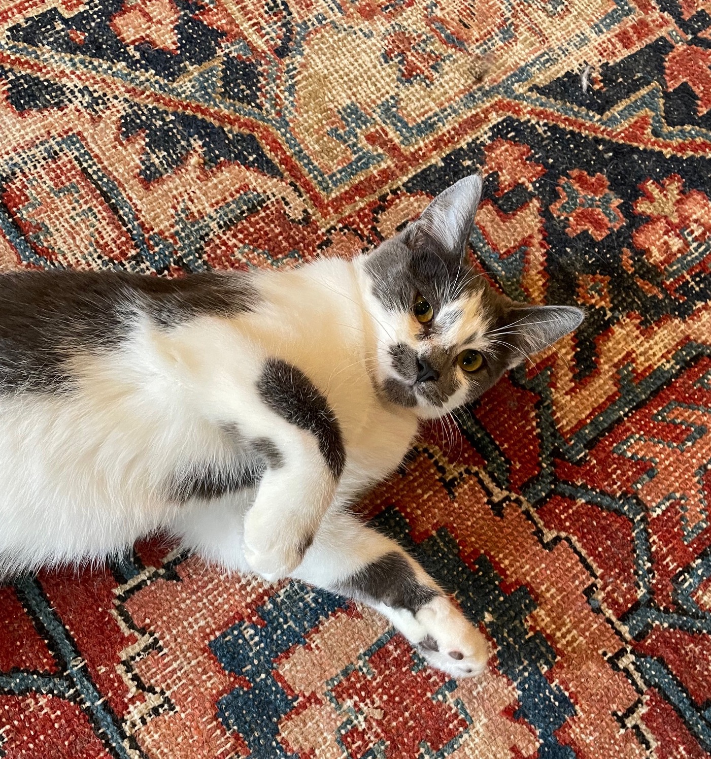 Kitty Girl is well behaved, litter box trained, and likes to cuddle. She has burst of energy, and then settles down. She comes when she is called, unless she's sound asleep. When a lap is available, she comes for love, then settles down next to her person. During dinner, she curls up on a dining chair and doesn't get on the table. She so far doesn't try to sharpen her claws on the furniture, but will sharpen her claws on throw rugs. She's very calm when riding in the car. Kitty Girl is looking for an exclusively indoor home where she can get lots of love and attention.